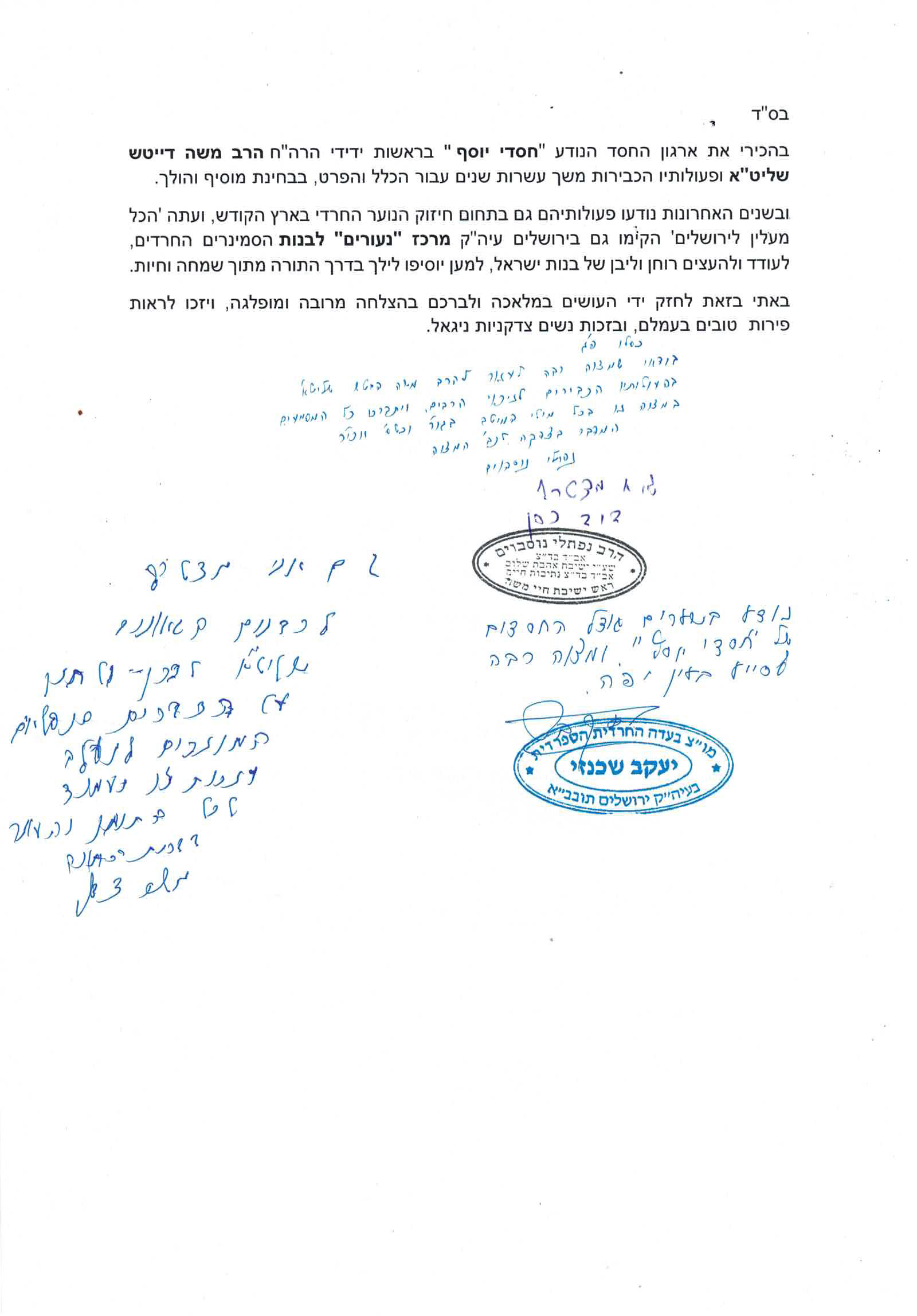 בהכירי את ארגון החסד הנודע 'חסדי יוסף' בראשות ידידי הרה"ח הרב משה דייטש שליט"א ופעולותיו הכבירות משך עשרות שנים עבור הכלל והפרט, בבחינת מוסיף והולך.